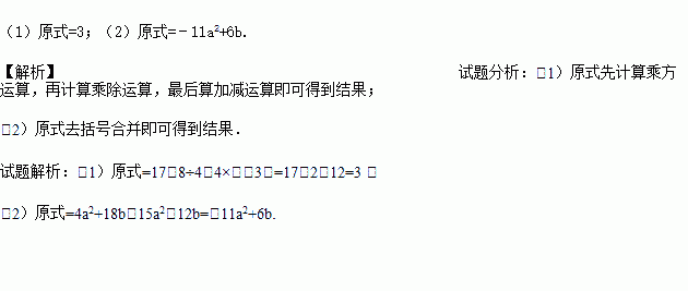 (1)17﹣8÷(﹣2)2+4×(﹣3) (2)2(2a2+9b)+3(﹣5a2﹣4b)