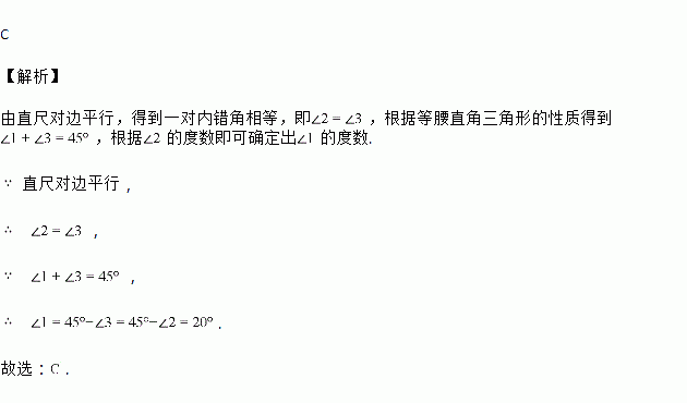 如图,把一块含有45°角的直角三角板的两个顶点分别放在直尺的一组对边上,如果∠2=25°,那么∠1的度数是( )