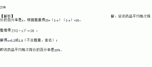 某药品原价每盒元,为了响应国家解决老百姓看病贵的号召,经过连续两次降价,现在售价每盒元,则该药品平均每次降价的百分率是______.