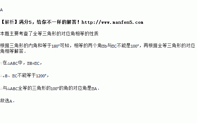 在△ABC中,∠B=∠C,与△ABC全等的三角形有一个角是100°,那么在△ABC中与这100°角对应相等的角是( )