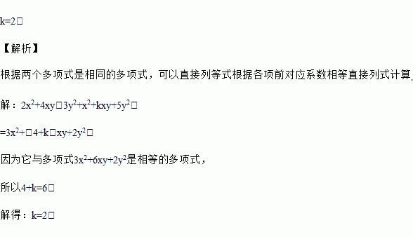 已知多项式2x2+4xy﹣3y2+x2+kxy+5y2,当k为何值时,它与多项式3x2+6xy+2y2是相等的多项式.