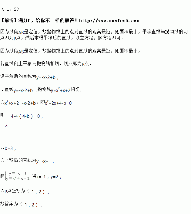 在平面直角坐标系中,抛物线y=x2+x+2上有一动点P,直线y=﹣x﹣2上有一动线段AB,当P点坐标为_____时,△PAB的面积最小.