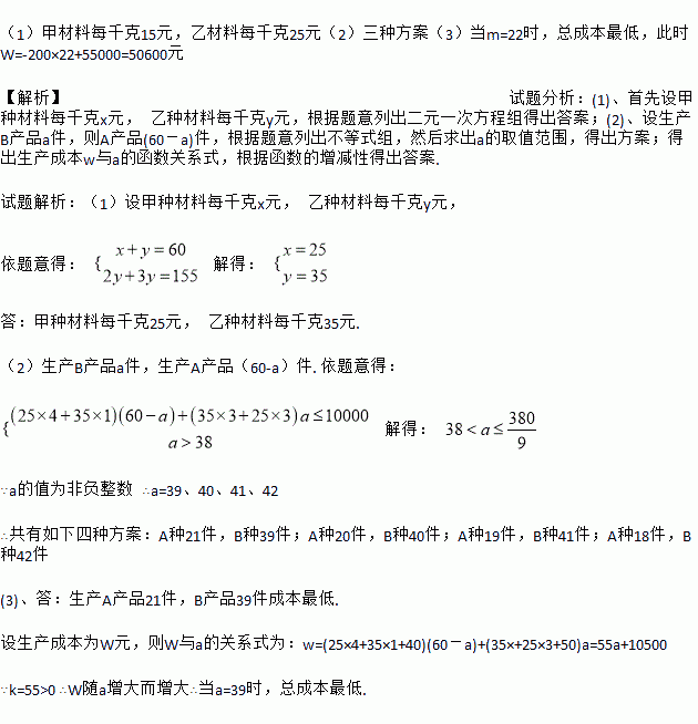 (2)现工厂用于购买甲、乙两种材料的资金不超过38000元,且生产B产品不少于28件,问符合条件的生产方案有哪几种?