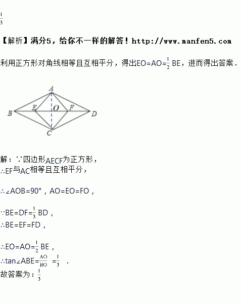 如图,在菱形ABCD中,点E、F在对角线BD上,BE=DF=BD,若四边形AECF为正方形,则tan∠ABE=_____.