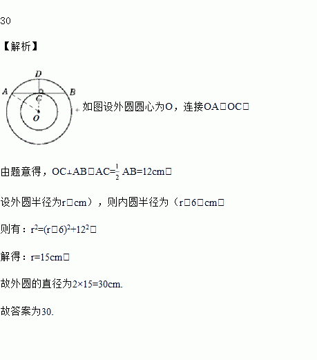 如图为一个玉石饰品的示意图,与中心在同一平面上的点A,B为外圆上的两点,且AB与内圆相切于点C,过点C作CD⊥AB交外圆于点D,测得AB=24 cm,CD=6 cm,则外圆的直径为________cm.