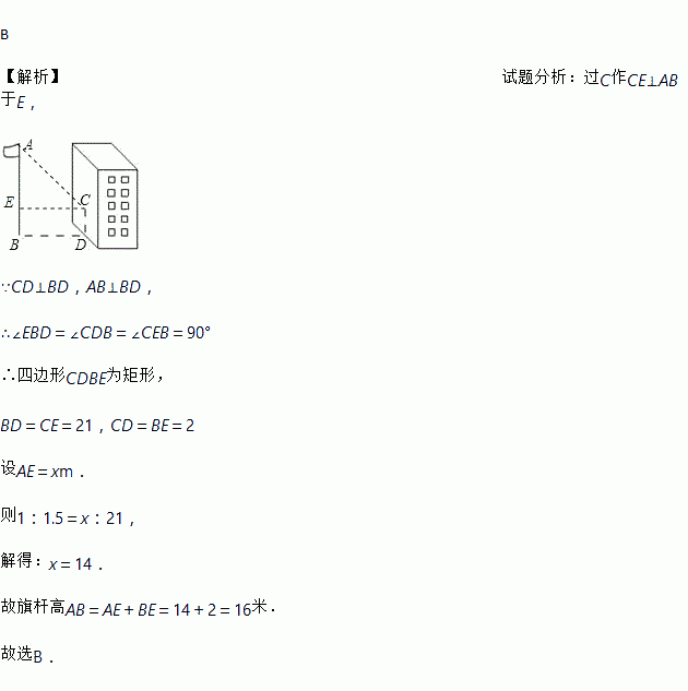 如图,某同学想测量旗杆的高度,他在某一时刻测得1米长的竹竿竖直放置时影长1.5米,在同一时刻测量旗杆的影长时,因旗杆靠近一楼房,影子不全落在地面上,有一部分落在墙上,他测得落在地面上影长为21米,留在墙上的影高为2米,旗杆的高度为().