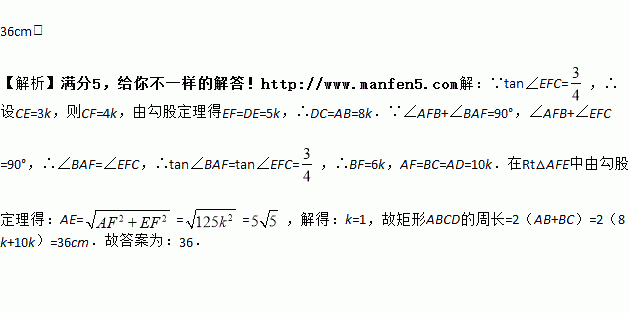 如图,折叠矩形ABCD的一边AD,使点D落在BC边的点F处,已知折痕AE=5cm,且tan∠EFC=,则矩形ABCD的周长是 .