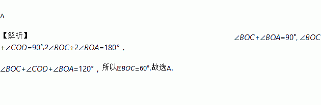 A 【解析】∠BOC+∠BOA=90°, ∠BOC+∠COD=90°,2∠BOC+2∠BOA=180°, ∠BOC+∠COD+∠BOA=120°,所以∠BOC=60°.故选A.
