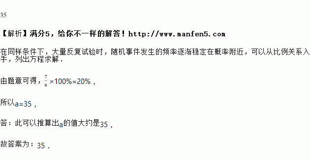 在一个暗箱里放有个除颜色外其它完全相同的球,这个球中红球只有个.每次将球搅拌均匀后,任意摸出一个球记下颜色再放回暗箱.通过大量重复摸球实验后发现,摸到红球的频率稳定在左右,由此可以推算出的值大约是________.
