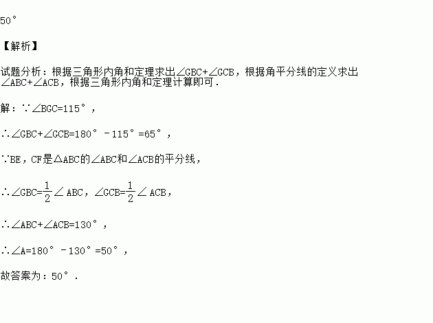如图,已知△ABC的∠ABC和∠ACB的平分线BE,CF交于点G,若∠BGC=115°,则∠A= .