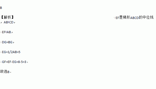 B 【解析】∵EF是梯形ABCD的中位线,AB∥CD, ∴EF∥AB, ∴DG=BG, ∴EG=1/2AB=5 ∴GF=EF-EG=8-5=3. 故选B.