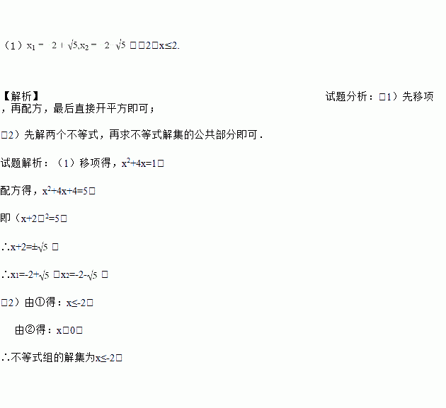 (1)用配方法解方程:x2+4x-1=0;(2)解不等式组: