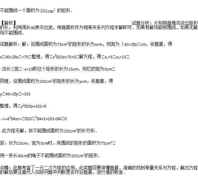 用一条长的绳子怎样围成一个面积为的矩形?能围成一个面积为的矩形吗?如能,说明围法;如不能,说明理由.