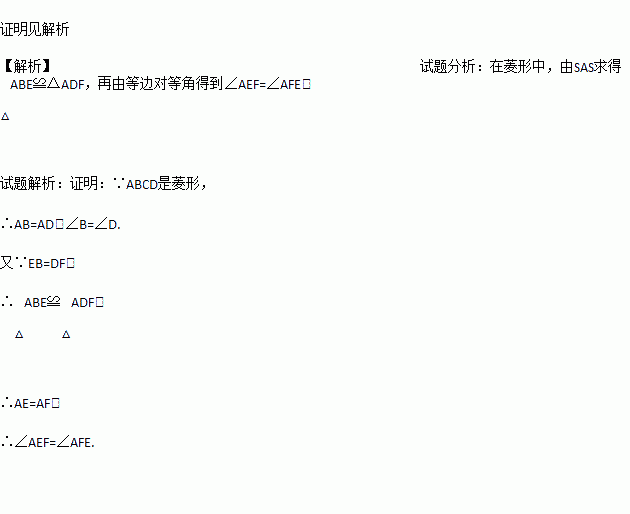 已知:如图,菱形ABCD中,E、F分别是CB、CD上的点,且BE=DF.求证:∠AEF=∠AFE.