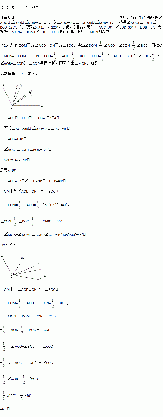如图(1),∠AOB=120°,在∠AOB内作两条射线OC和OD,且OM平分∠AOD,ON平分∠BOC.