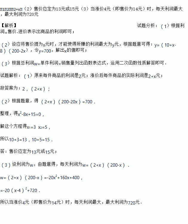 (1)2;(2+x)(2)售价应定为13元或15元(3)当涨价4元(即售价为14元)时,每天利润最大,最大利润为720元 【解析】试题分析:(1)根据利润=售价-进价表示出商品的利润即可; (2)设应将售价提为x元时,才能使得所赚的利润最大为y元,根据题意可得:y=(10+x-8)(200-2x),令y=700,解出x的值即可; (3)根据总利润w=单件利润×销售量列出函数表达式...