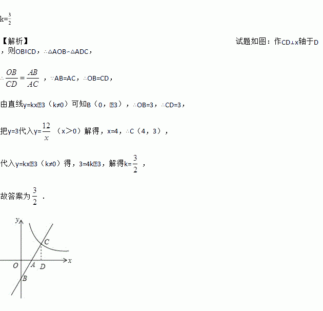 如图,已知一次函数y=kx﹣3(k≠0)的图象与x轴,y轴分别交于A,B两点,与反比例函数y=(x>0)交于C点,且AB=AC,则k的值为_____.