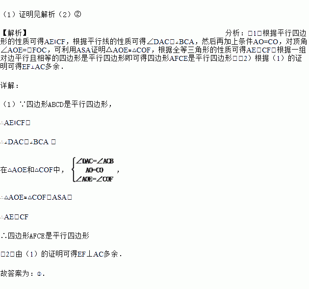 如图,①四边形ABCD是平行四边形,线段EF分别交AD、AC、BC于点E、O、F,②EF⊥AC,③AO=CO.
