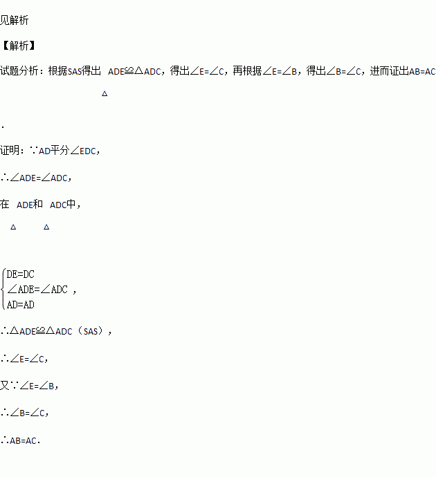 如图,已知在△ABC中,D为BC上的一点,AD平分∠EDC,且∠E=∠B,ED=DC.求证:AB=AC.