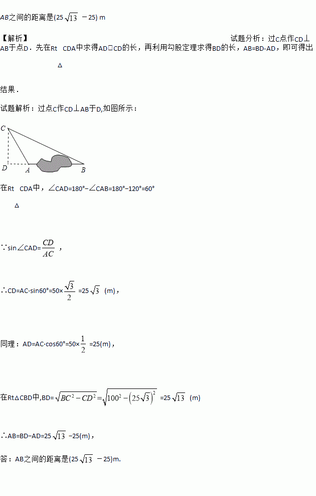 在一次课外实践活动中,同学们要测量某公园人工湖两侧A,B两个凉亭之间的距离.现测得AC=50m,BC=100m,∠CAB=120°,请计算A,B两个凉亭之间的距离.