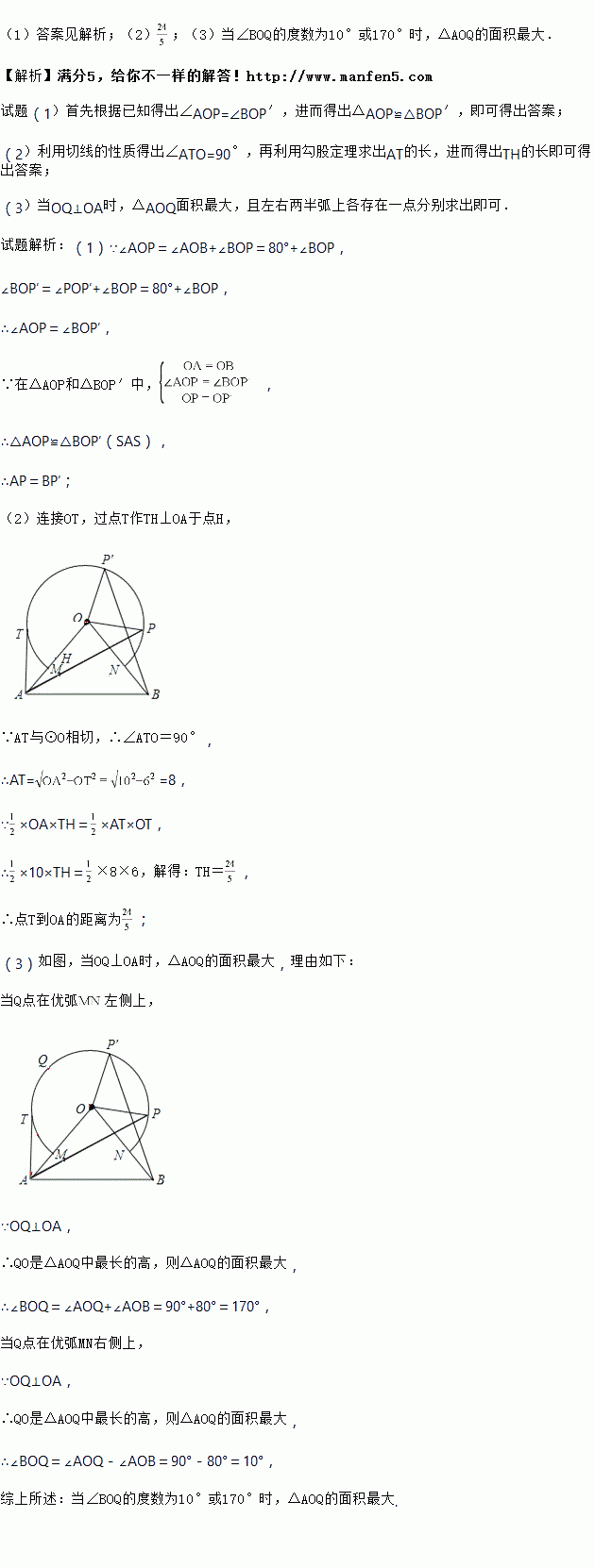 (1)点P在右半弧上(∠BOP是锐角),将OP绕点O逆时针旋转80°得,求证:AP=BP;![]()