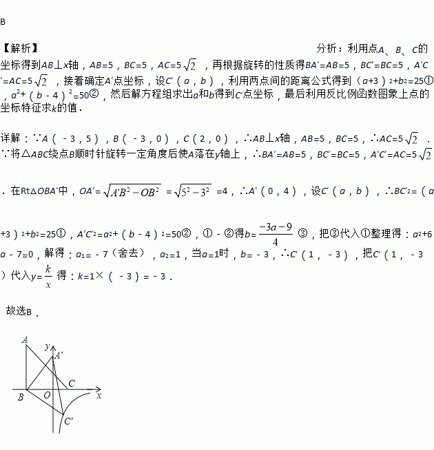 如图,△ABC三个顶点A(-3,5),B(-3,0),C(2,0),将△ABC绕点B顺时针旋转使A落在y轴上,与此同时顶点C恰好落在