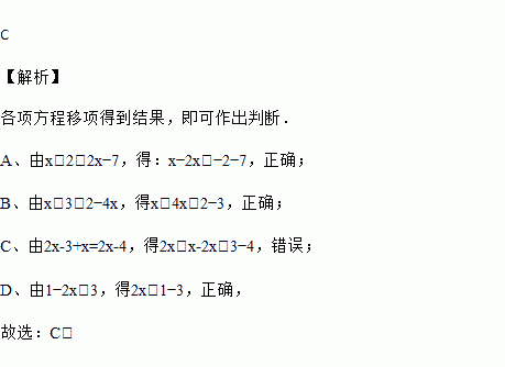 A. 由x+2=2x-7,得x-2x=-7-2 B. 由x+3=2-4x,得x+4x=2-3