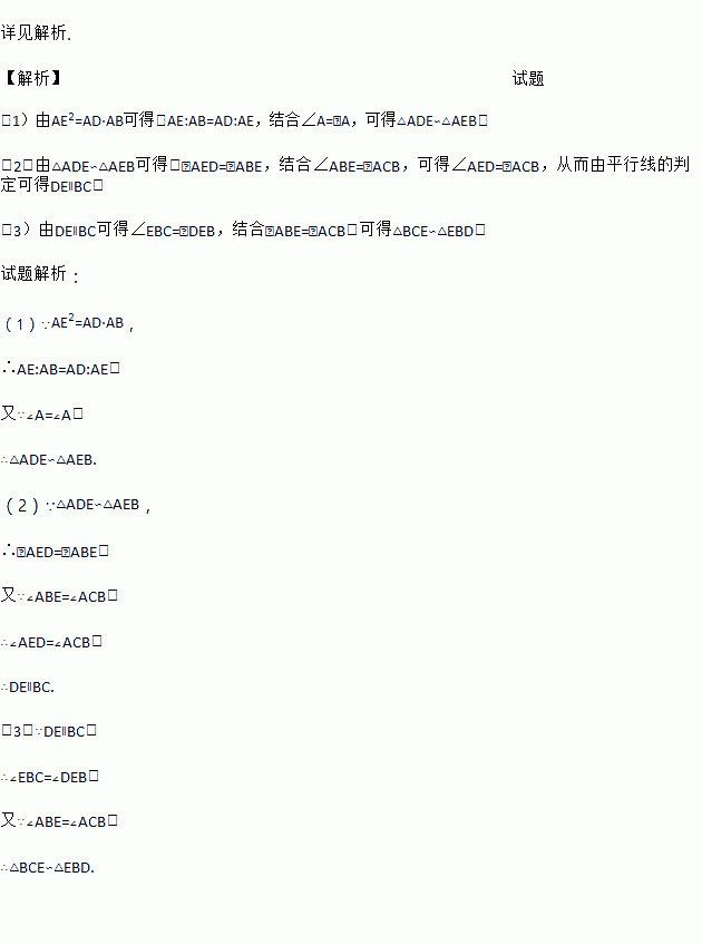 证明:(1)△ADE∽△AEB; (2)DE∥BC; (3)△BCE∽△EBD.