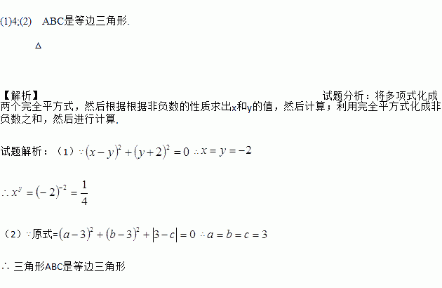 (1)4;(2) △ABC是等边三角形. 【解析】试题分析:将多项式化成两个完全平方式,然后根据根据非负数的性质求出x和y的值,然后计算;利用完全平方式化成非负数之和,然后进行计算. 试题解析:(1)∵∴ (2)∵原式=∴ 三角形ABC是等边三角形