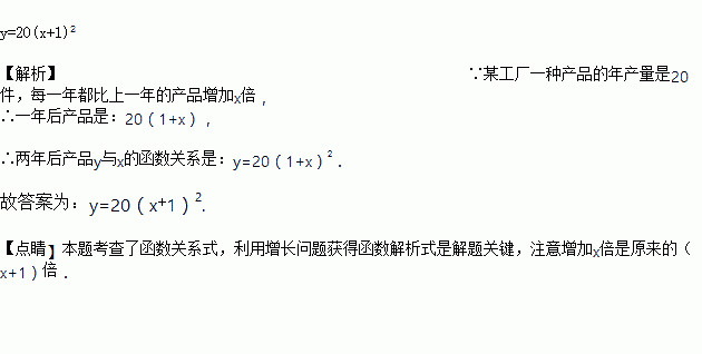 某工厂有一种产品现在的年产量是20万件,计划今后两年增加产量,如果每年都比上一年的产量增加x倍,那么两年后这种产品的产量y将随计划所定的x的值而确定,那么y与x之间的关系应表示为_____.