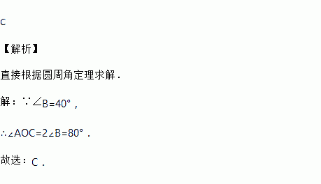 如图,点A,B,C均在⊙0上,若 ∠B =40°,则∠AOC的度数为 ( )