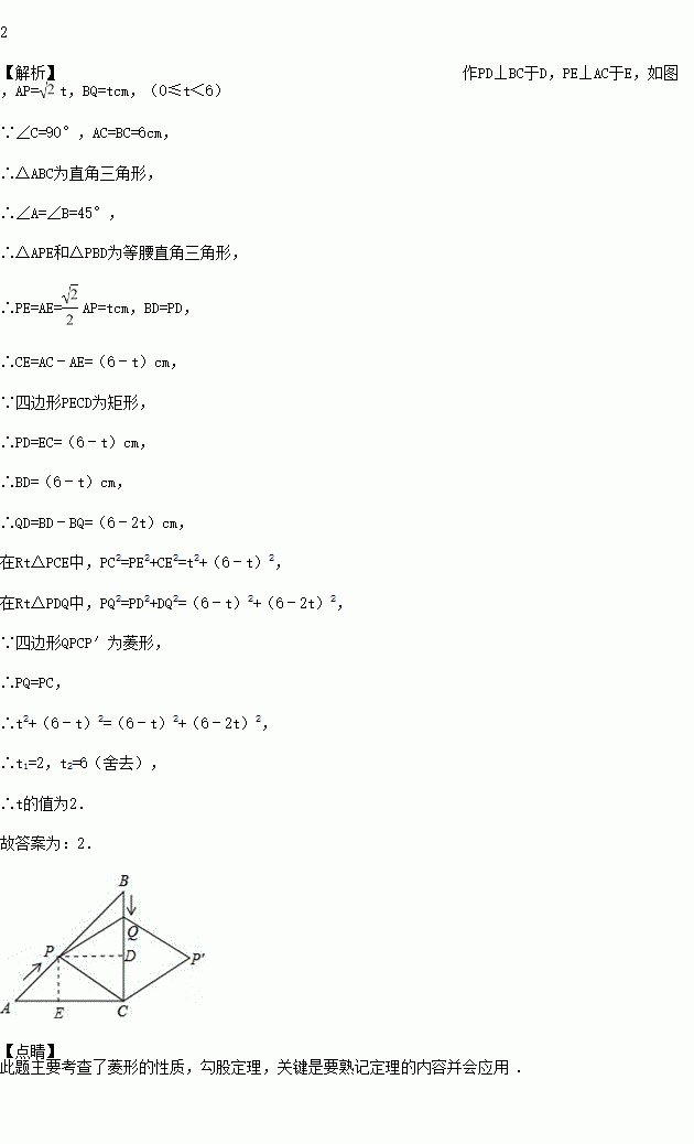 cm的速度向终点B运动;同时,动点Q从点B出发沿BC方向以每秒1cm的速度向终点C运动,将△PQC沿BC翻折,点P的对应点为点P′,设Q点运动的时间为t秒,若四边形QPCP′为菱形,则t的值为_____.