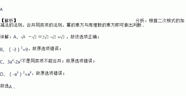 A. -= B. (-3)2=6 C. 3a4-2a2=a2 D. (-a3)2=a5