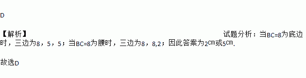 D 【解析】试题分析:当BC=8为底边时,三边为8,5,5;当BC=8为腰时,三边为8,8,2;因此答案为2㎝或5㎝. 故选D