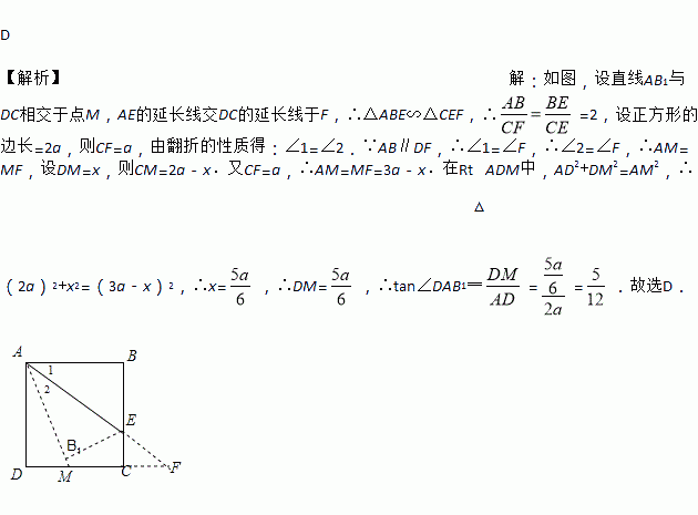 已知正方形ABCD,点E在线段BC上,且BE=2CE,连接AE,将△ABE沿AE翻折,点B落在点B1处,则tan∠DAB1的值为( )