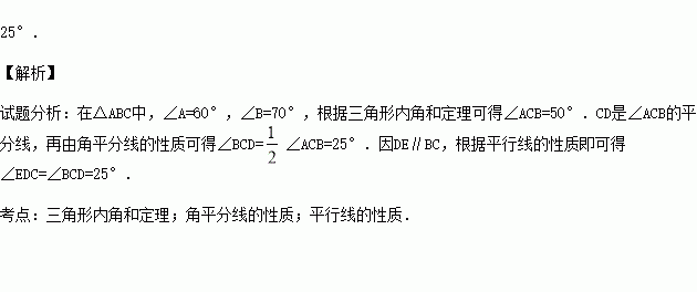 如图,△ABC中,∠A=60°,∠B=70°,CD是∠ACB的平分线,点E在AC上,DE∥BC,则∠EDC的度数为 .