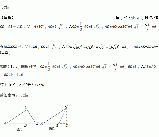 已知在△ABC中,BC=6,AC=6,∠A=30°,则AB的长是_____.