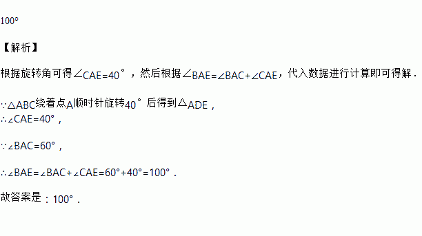 如图,在△ABC中,∠BAC=60°,将△ABC绕着点A顺时针旋转40°后得到△ADE,则∠BAE=_____.