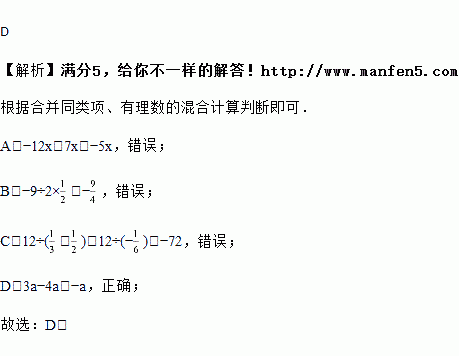 A. ﹣12x+7x=5x B. ﹣9÷2×=﹣9