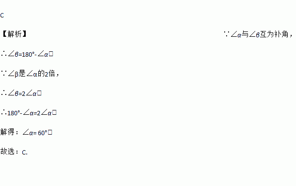 C 【解析】∵∠α与∠β互为补角, ∴∠β=180°-∠α, ∵∠β是∠α的2倍, ∴∠β=2∠α, ∴180°-∠α=2∠α, 解得:∠α= 60°, 故选:C.