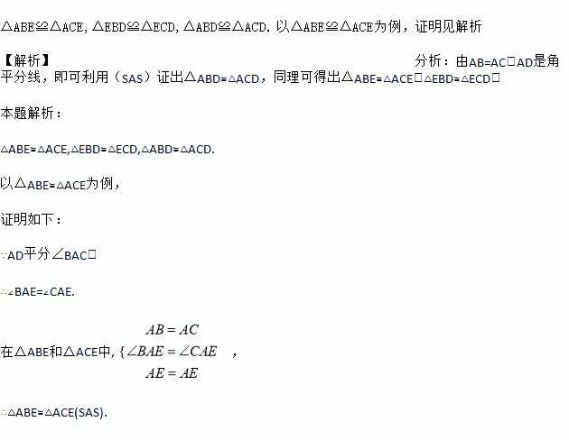 如图,在△ABC中,AB=AC,AD是角平分线,点E在AD上,请写出图中两对全等三角形,并选择其中的一对加以证明.