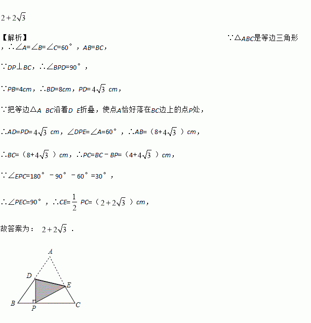如图,把等边△A BC沿着D E折叠,使点A恰好落在BC边上的点P处,且DP⊥BC,若BP=4cm,则EC=______cm.