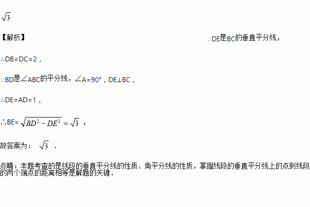如图,在Rt△ABC中,∠A=90°,∠ABC的平分线BD交AC于点D,DE是BC的垂直平分线,点E是垂足.若DC=2,AD=1,则BE的长为______.