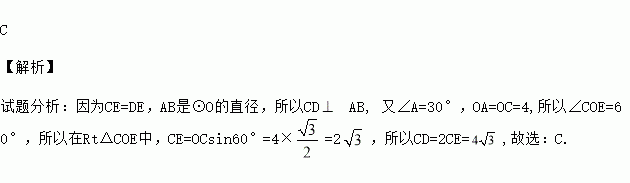 如图,⊙O的直径AB与弦CD(不是直径)交于点E,且CE=DE,∠A=30°,OC = 4,那么CD的长为