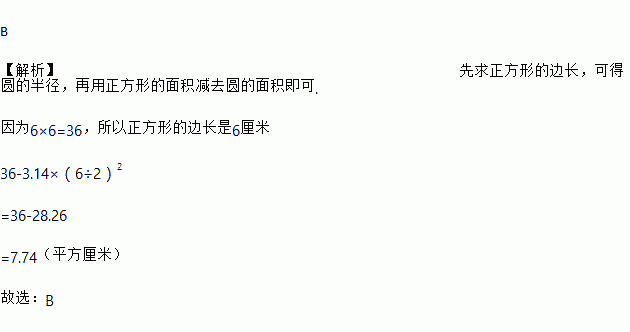 如图,已知正方形面积为36平方厘米,圆与各边相接,则阴影部分的面积是( )平方厘米.()
