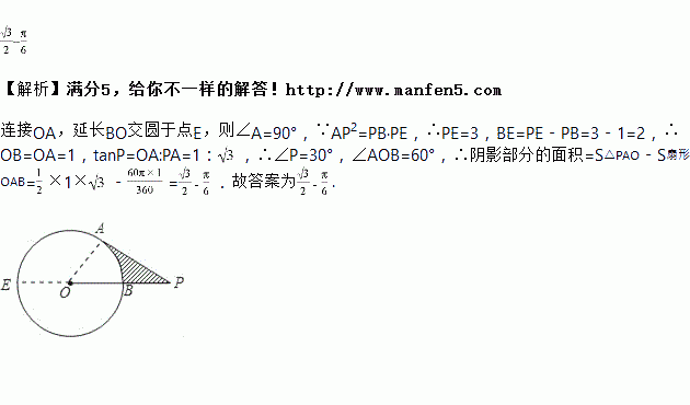 如图,PA切⊙O于A,OP交⊙O于B,且PB=1,PA=,则阴影部分的面积:S=_____.