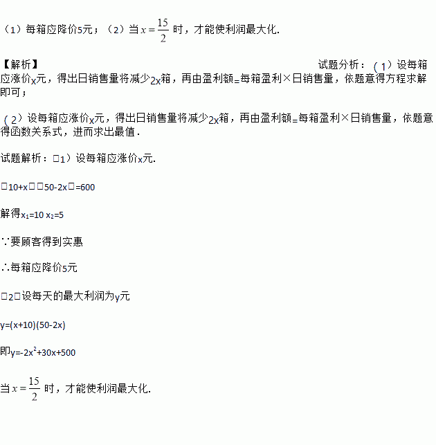(1)每箱应降价5元;(2)当时,才能使利润最大化. 【解析】试题分析:(1)设每箱应涨价x元,得出日销售量将减少2x箱,再由盈利额=每箱盈利×日销售量,依题意得方程求解即可; (2)设每箱应涨价x元,得出日销售量将减少2x箱,再由盈利额=每箱盈利×日销售量,依题意得函数关系式,进而求出最值. 试题解析:(1)设每箱应涨价x元. (10+x)(50-2x)=600 解...