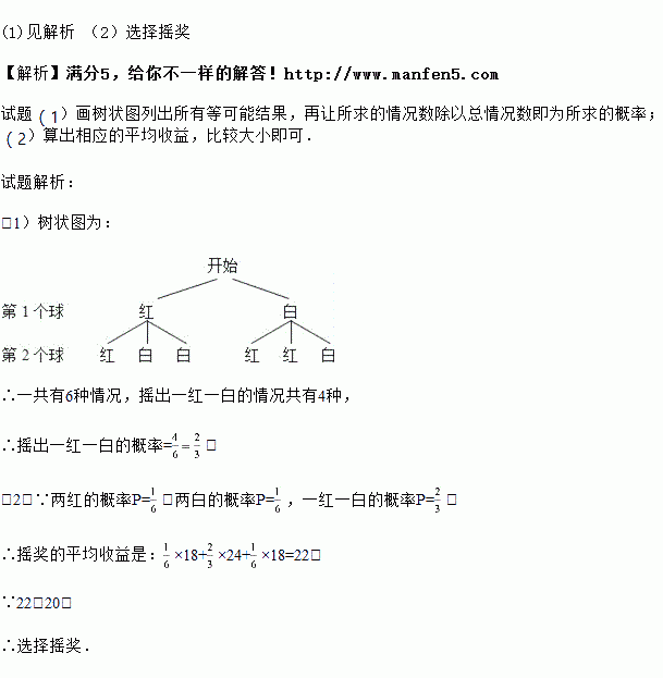 (1)请你用列表法(或画树状图法)求一次连续摇出一红一白两球的概率.