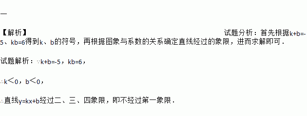 一 【解析】试题分析:首先根据k+b=-5、kb=6得到k、b的符号,再根据图象与系数的关系确定直线经过的象限,进而求解即可. 试题解析:∵k+b=-5,kb=6, ∴k<0,b<0, ∴直线y=kx+b经过二、三、四象限,即不经过第一象限.