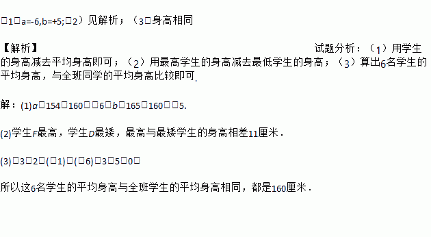 (1)a=-6,b=+5;(2)见解析;(3)身高相同 【解析】试题分析:(1)用学生的身高减去平均身高即可;(2)用最高学生的身高减去最低学生的身高;(3)算出6名学生的平均身高,与全班同学的平均身高比较即可. 【解析】 (1)a=154-160=-6,b=165-160=+5. (2)学生F最高,学生D最矮,最高与最矮学生的身高相差11厘米. (3)-3+2+(-1)...
